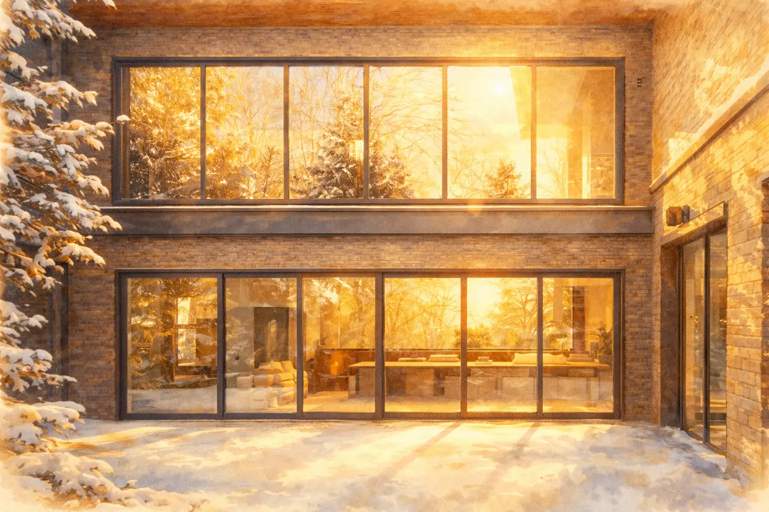 Большая площадь остекления требует особого подхода к теплотехнике. Чтобы рядом с витражом было комфортно даже зимой, используют многокамерные стеклопакеты и теплые профили. Узлы примыкания тщательно утепляют, применяя монтажные ленты и герметики, иначе даже самые качественные окна могут начать промерзать по контуру.